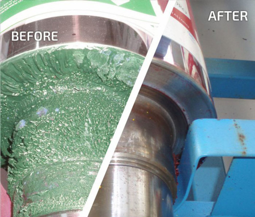 78.5℃的干冰顆粒作用在被清洗的物體表面時,首先冷凍脆化污物,污物在被清洗的表面上破裂,由粘彈態(tài)變成固態(tài),且脆性增大,粘性減小,使之在表面上的吸附力驟減,同時表面積增大,部分污物可以自動剝離。